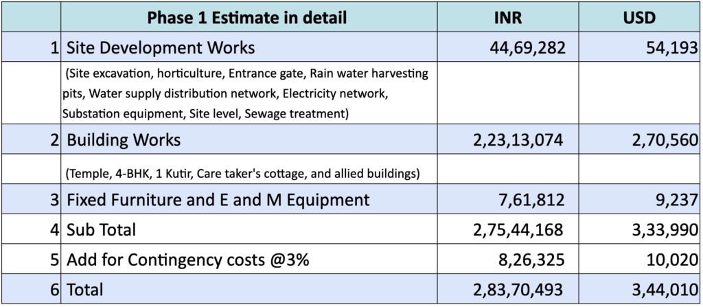 The land for Guru Kripa has already been purchased, thanks to extremely generous donations from Ananda friends. The project is planned in three phases. They are shown on the right. Below is an estimate of what we will need to finish Phase 1. Learn more about how to donate to support the Hermitage project.